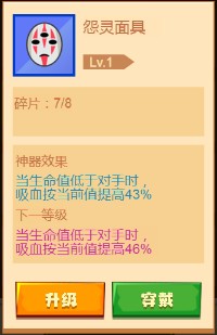 怨灵面具附带的神器效果是当生命值低于对手时,吸血按当前值提升百分之43%。很明显这件神器很适合打后手,当残血时不至于让对方一直克制。可以起到暂缓的作用甚至于反杀地方,所以这件装备更适用于竞技场。