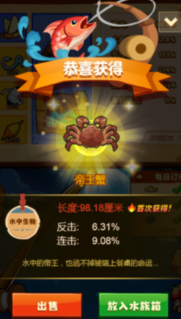 3、然后就是这一渔场最稀有的图鉴任务---水中的帝王帝王蟹。它是属于水中生物种类的,并且它能够给我们增加反击属性以及连击属性,小编在上一期说过,这一个鱼获对于连击类小伙伴简直是天作之合。对于渔具的要求为橙色鱼漂一级以上及金色鱼线二十级以上。