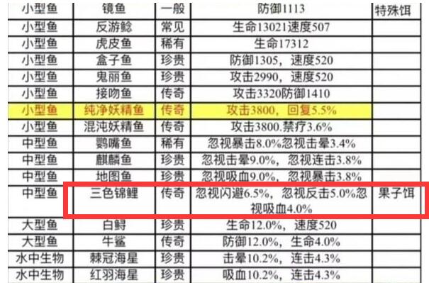 三色锦鲤是金色中型鱼 ,忽视闪避6.5% 忽视反击5.0%忽视吸血4.0%,大家可以用果子饵去钓