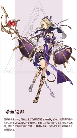 沙亚特王族的第二继承人,蓝斯的孪生妹妹。壹样继承了英雄王汉弥尔的血脉,但在封建思想严重的圣焰王国中却未如其兄般收到重视。自幼在皇家刻意的安排下修习圣灵术法,并加入了断罪之翼的阵容,个性体贴善良,而且似乎与艾尔扎克有着令人意外的关系。