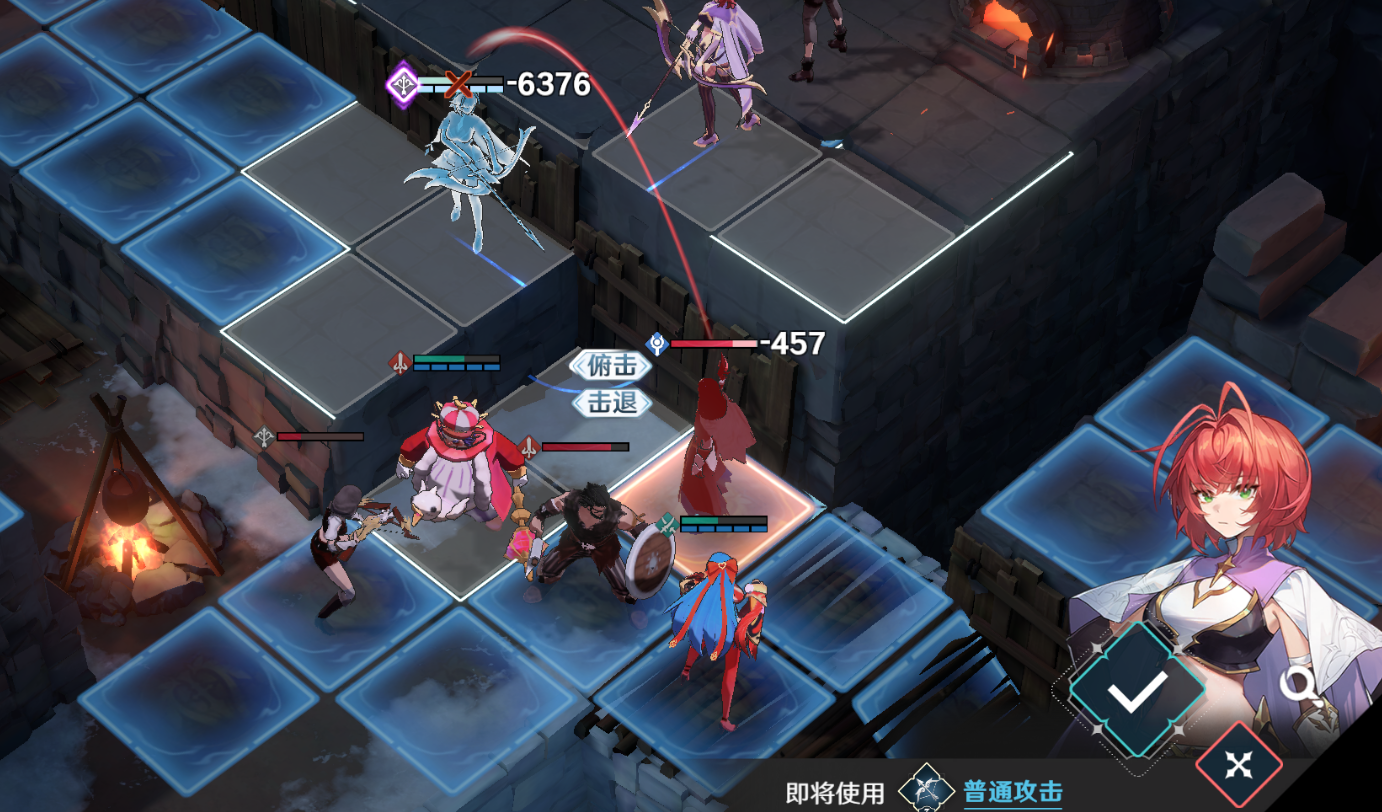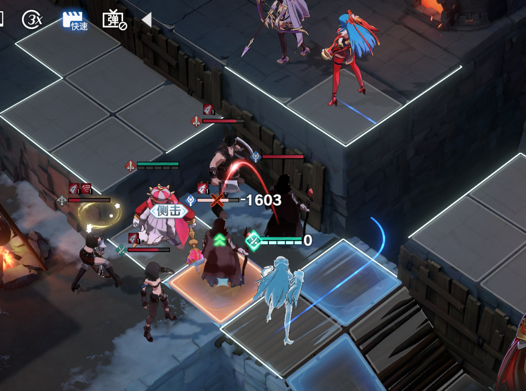 第三关与前两关相比难度激增,不但敌人数量众多,并且基本没法指望一个一个地拉怪解决,再加上射程极远的弓箭手,以及移动范围广、稍有机会就能偷残血单位的盗贼,让整个战局变得非常麻烦,因此就需要玩家合理利用单位在高低差上的攻击范围限制,以及雪拉的技能【八相奥义·皆无】的高额输出,尽快解决敌人威胁最大的盗贼和弓箭手以降低敌人的DPT,免得哪个角色单回合被多次普攻单点击杀。