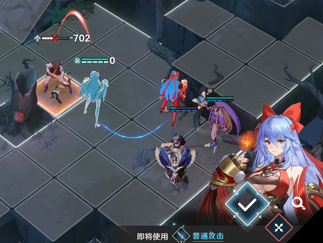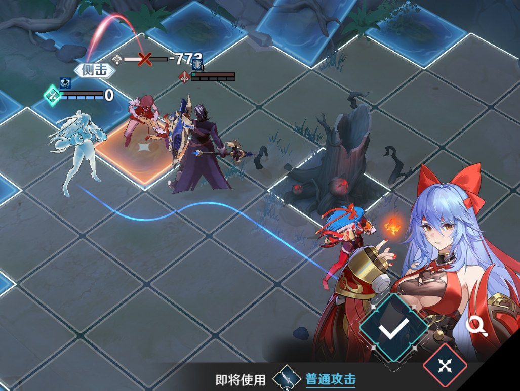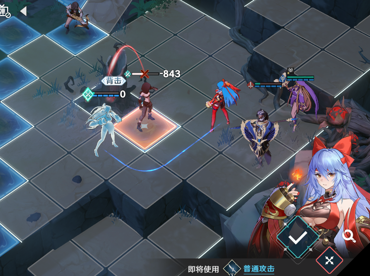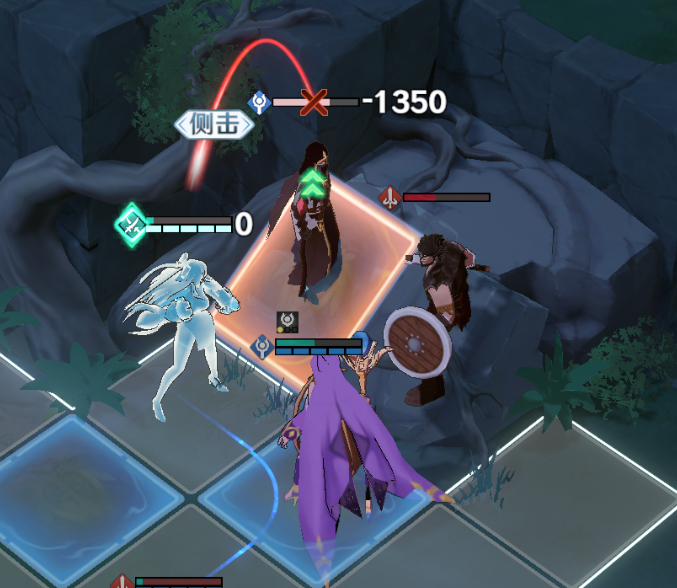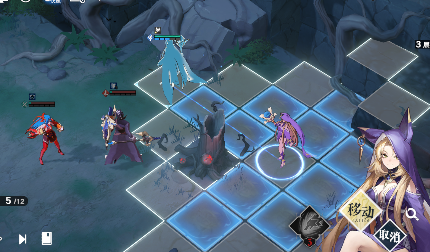 雪拉再往下走,从侧面普攻一次弓箭手即可回合结束,如果将莫尔顿移动下去补刀会提前将左上方的战士+法师组合引下来,导致失败。