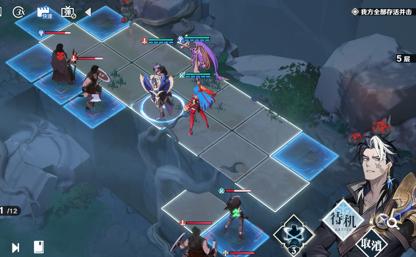再下个回合让莫尔顿和雪拉配合击杀弓箭手,站位最好不要错,避免上方的战士+法师下来误伤。