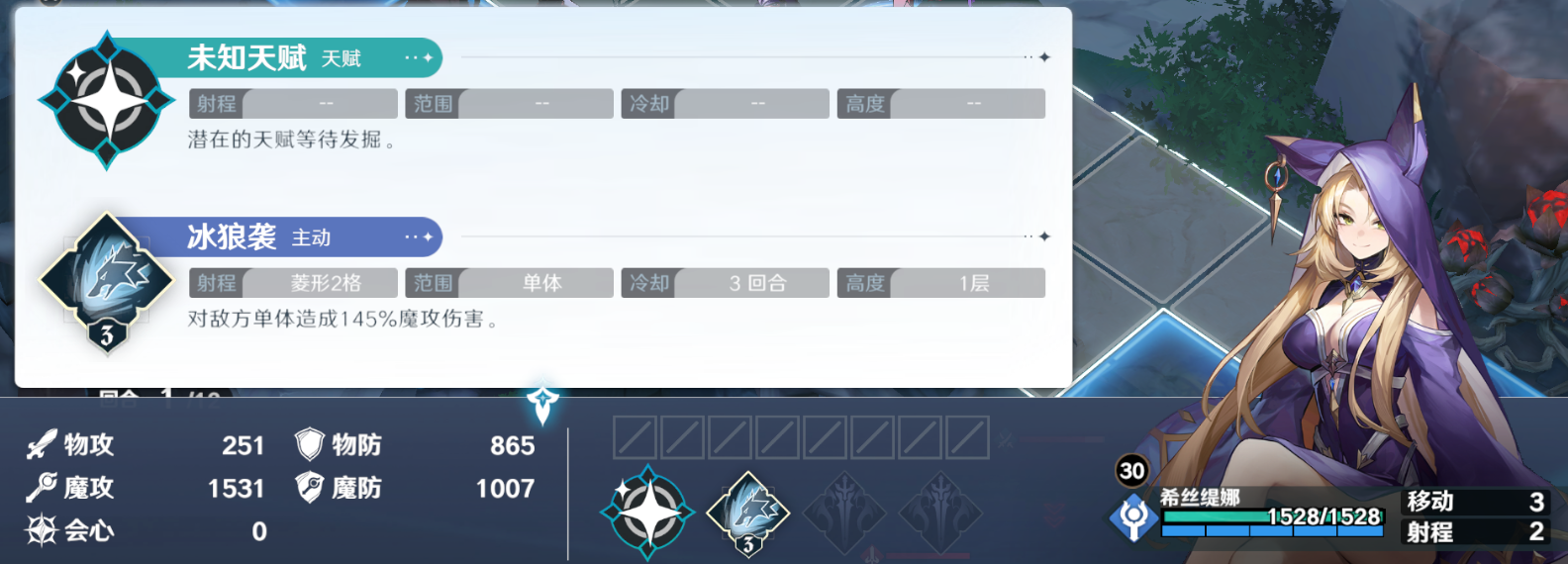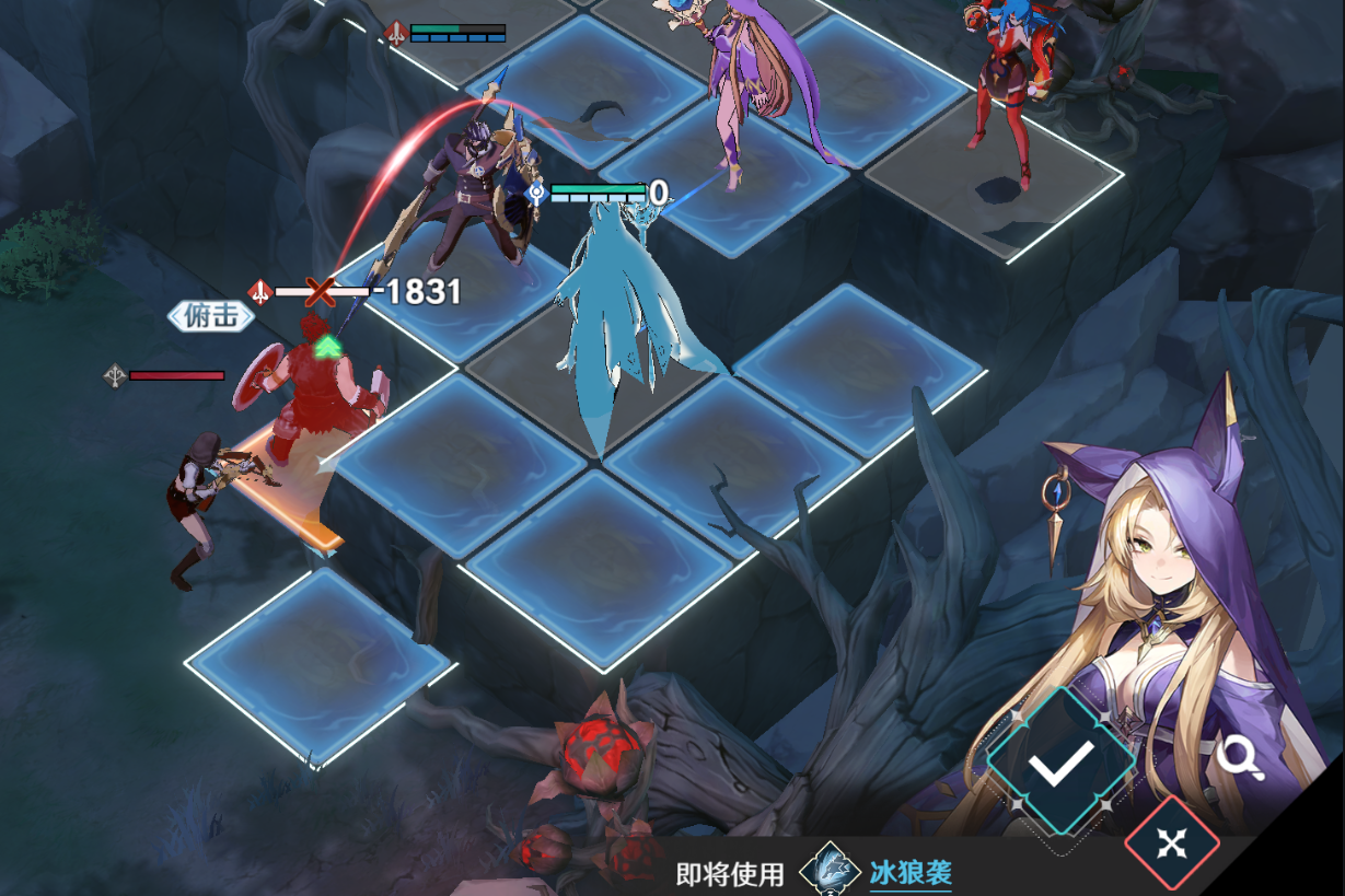 再让刚才一直后方待机的希丝缇娜两次移动到如图的位置后回合结束,勾引上方的战士+法师组合下来,位置不要错,如果再往上一个台阶就会让战士能绕到希丝缇娜前方触发压制,导致下回合的【冰狼袭】没法将他秒杀。