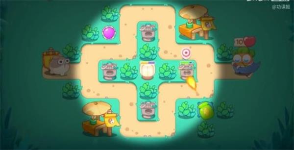 1.第一关开图右下角三个瓶子炮,其中一个两级,左上角一个两级瓶子炮,清中间的草,清完草建两个瓶子炮亮灯。