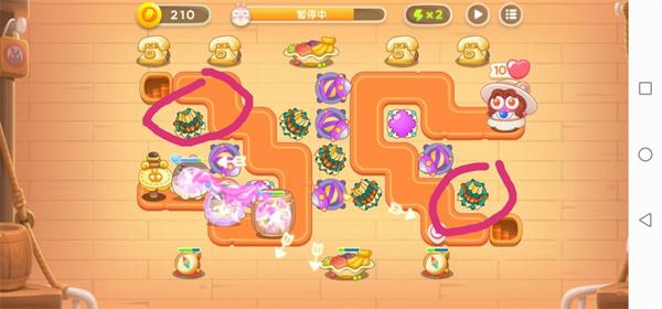 1.开局:在下面标注区域建好一个满级多重箭,清理左下角的钱袋(小怪不用管,直接会被多重箭的散弹打死)随后会出现一只滑翔兔,用你目前全部的金币建好一个烟花塔来对付它(位置自己看当时情况)。