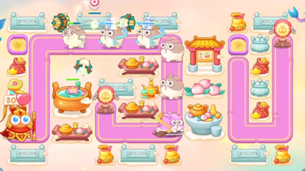 3.打掉之后,在之前酒壶障碍物的位置放一个箭塔,然后锁定下面的大鼎障碍物。把两个靠下的箭塔升到2级。