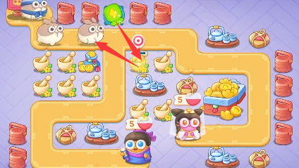 2、开局放置炮塔开图,开完一个道具格子就放置一个炮塔继续向下开图,注意跑的快的兔子优先解决。