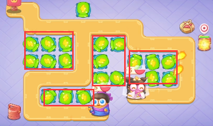 1、这一关我们可以选择的炮塔有鞭炮、便便、太阳、火瓶,普通炮塔,我们这一关使用什么炮塔都可以,开图使用鞭炮比较快。