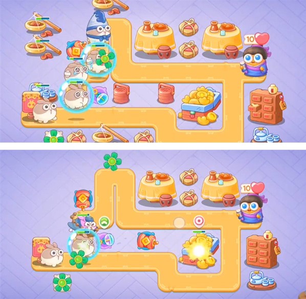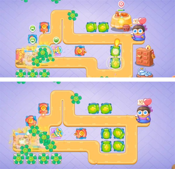 3.放置完成之后我们就可以开始打了,炮仗清理左侧的障碍物,非常的快的,而泡泡塔只需要减速即可;
