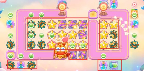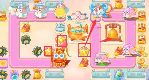 1、这一关我们可以选择的炮塔为毒针、多重箭、泡泡塔、星星、烟花,这一关我们使用多重箭输出星星防空。