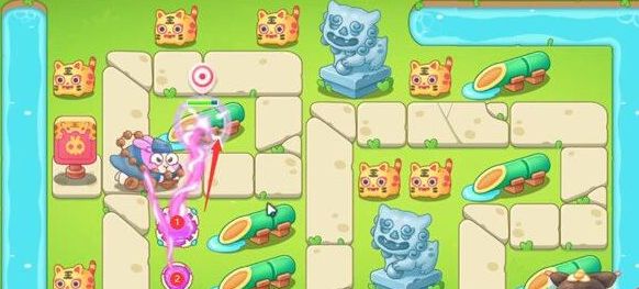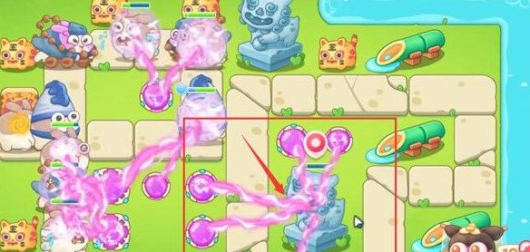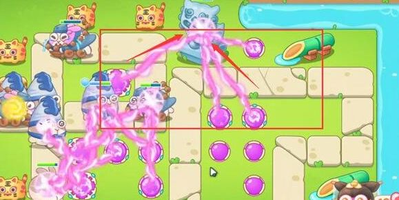 3、第二波我们需要迅速清理箭头所示的障碍物,把2号魔法球升满级且放置3号魔法球。