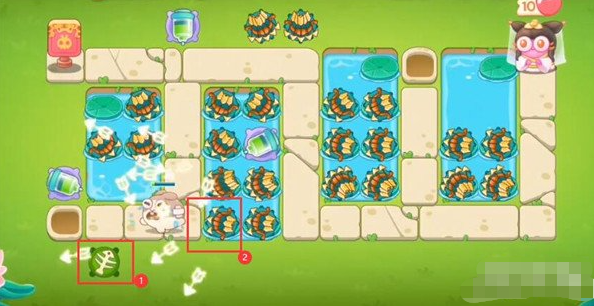 5、第9波在下面放一个鱼骨,障碍物全部清理,中间荷叶上面在放置多重箭,具体塔防如下。