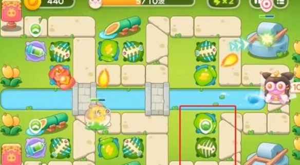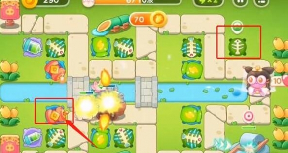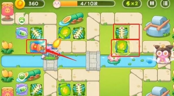 2、第二波左上方加一毒针塔升一级,左下方也加一毒针塔升一级,中间加一鱼骨头,中间下方也加一鱼骨头。