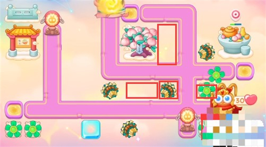 6、放置炮塔位置在下图的框内,蟠桃树附近放置火瓶打持续伤害,中间位置放置多重箭输出,出口处放置风扇,拐角处放置雪球。