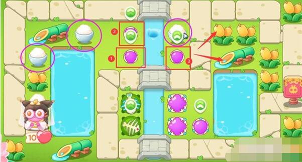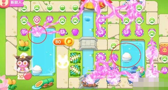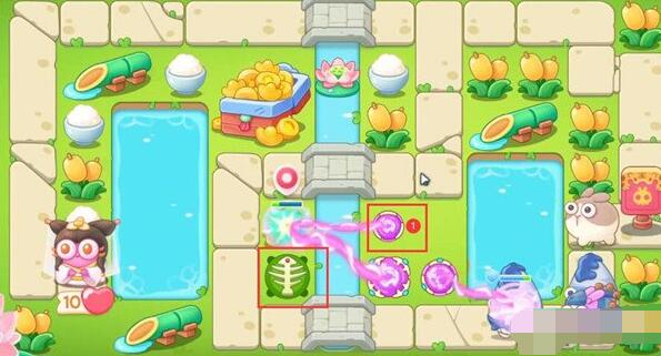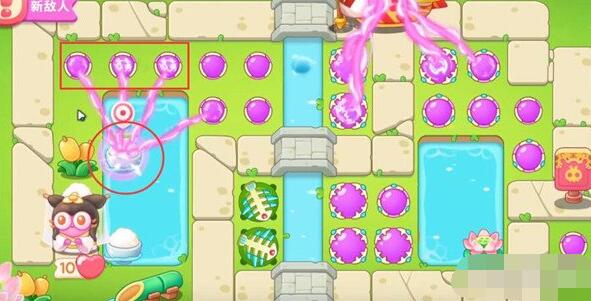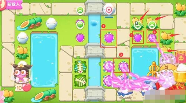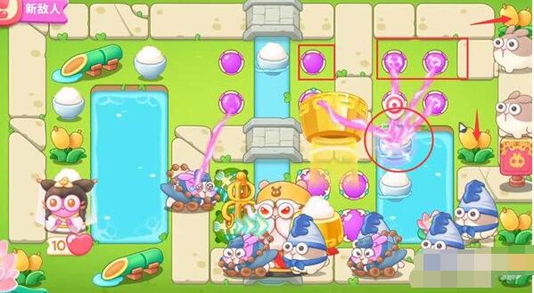 6、我们第四波开始把1魔法球升级,打米饭,放置2魔法球,右边图开后再放置两个魔法球,同时接着打附近道具。