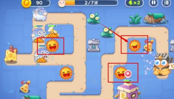 7、第七波中间加满级太阳花,具体炮塔如下图。