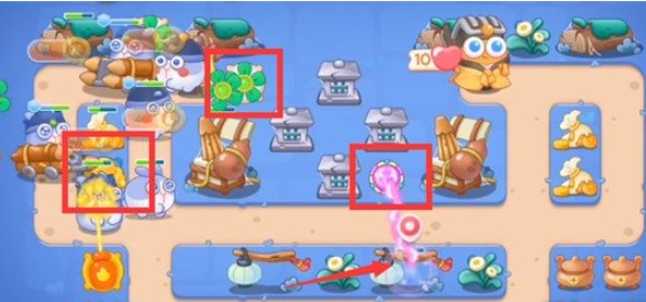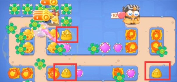 3.第三波在拐角处放置满级火炮瓶,魔法球,锁定钱袋,依次拆除障碍物;