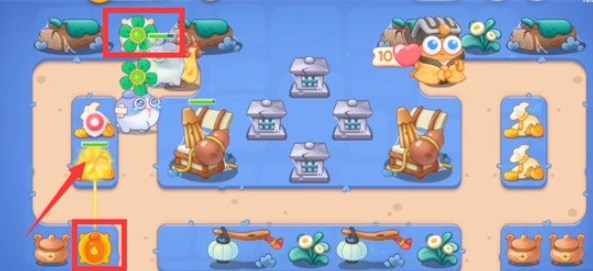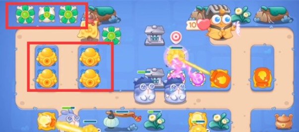 1.开局在下放位置建造一个风扇塔并升级至二级,有钱后放置一个火炮瓶,锁定上方的钱袋;