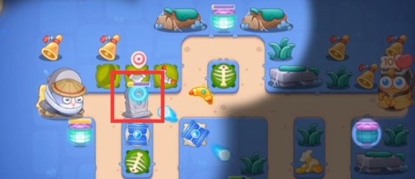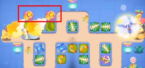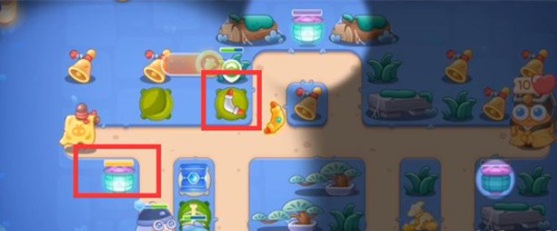 3.在拐弯处放置回旋镖,开始向右清理道具,拆除障碍物顺序如下图: