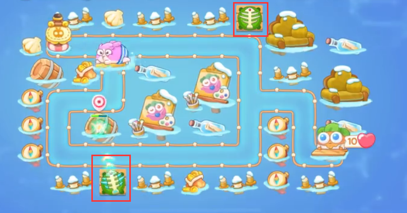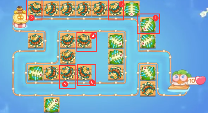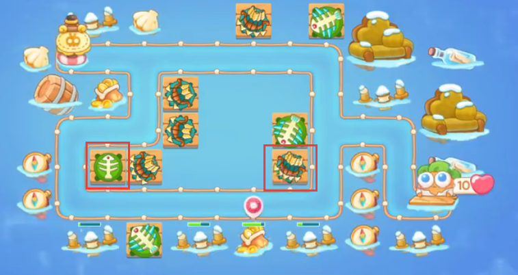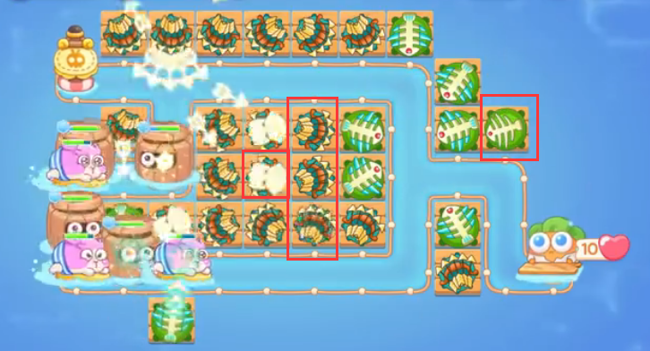 3、在下面鱼刺打掉的道具位置放一个弓箭。等上面鱼刺打掉了,继续放弓箭。中间大道具清理,依旧放弓箭。