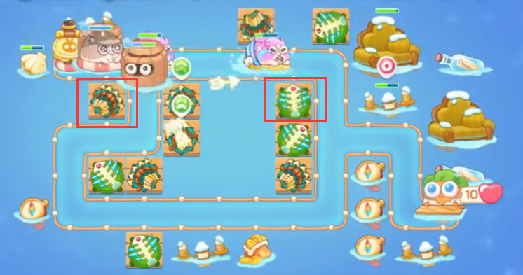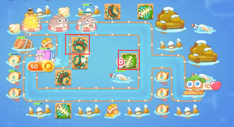 1、这一关会给鱼刺或火瓶,建议玩家刷魔法球、船锚或弓箭。有减速塔的话就更好了。