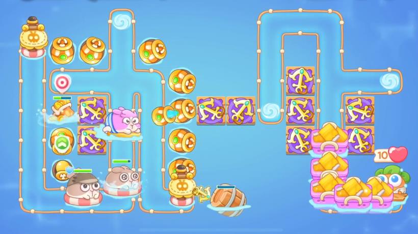 1、首先开局兔兔洞口放船锚和弓箭,先消掉右边贝壳。