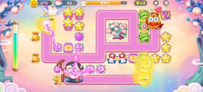 7、根据上面的思路在消灭掉兔子后尽量早点打掉桃树,让桃子早点掉下来,按上面的布局来打,基本上能轻松通过挑战。