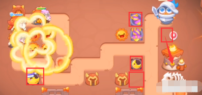 5、具体炮塔如下,前面放置四个太阳花,萝卜附近烟花,每个区域月亮减速。