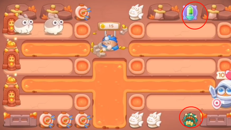 2、钱足够之后就可以在下面和上面建造炮台,继续清理石头,钱不够可以点中间的兔子得钱。