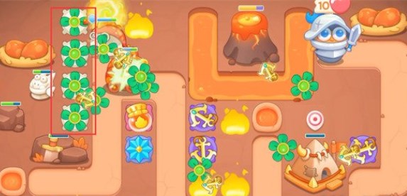 4、如图所示位置放置一个雪花塔,雪花塔可以冻结一定范围的兔子,配合上面的喷火瓶可以打出更多的伤害