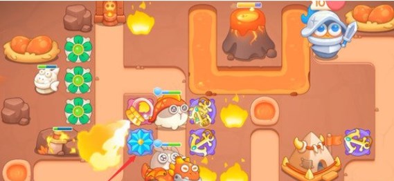 7、在下方接着补上一个喷火瓶,此时我们的输出已经完全足够,并且也达成了道具全清的效果,后面只需要不断的增加升级新炮台就可以顺利通关