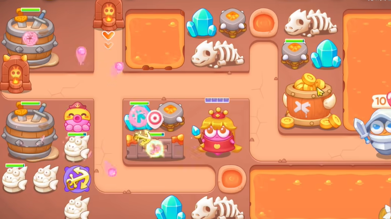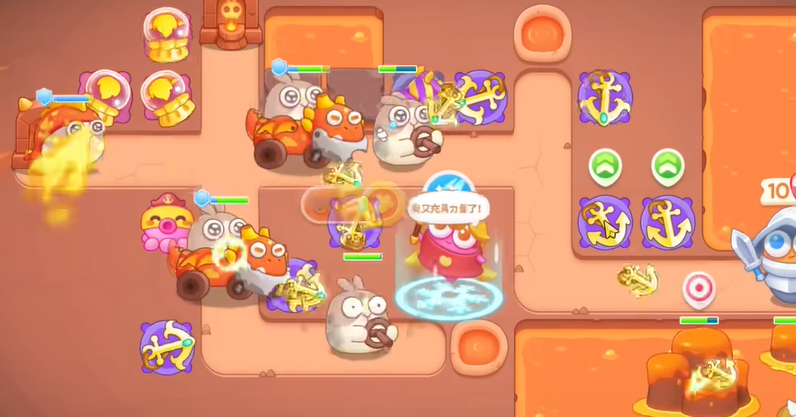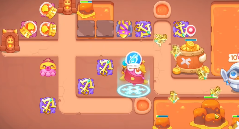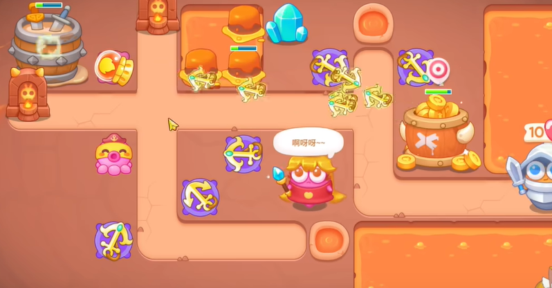 2、有金币了在左上建立一个喷火器,空出位置建立一个船锚,继续清理障碍物,有金币有升级塔防。