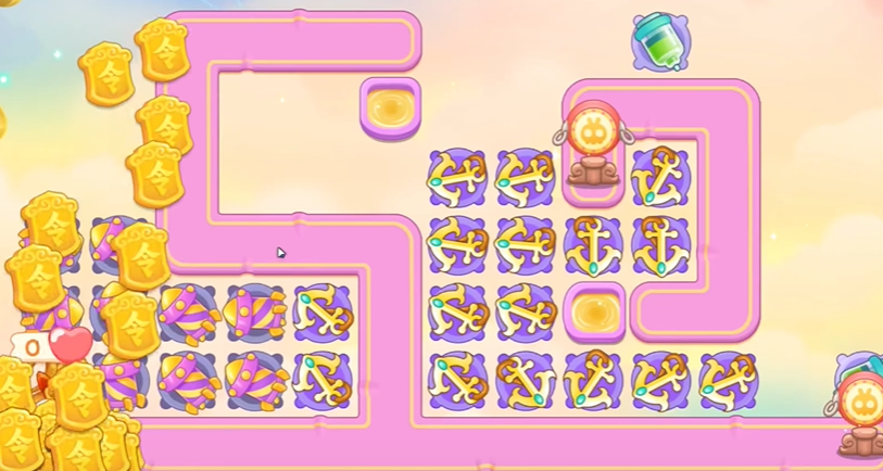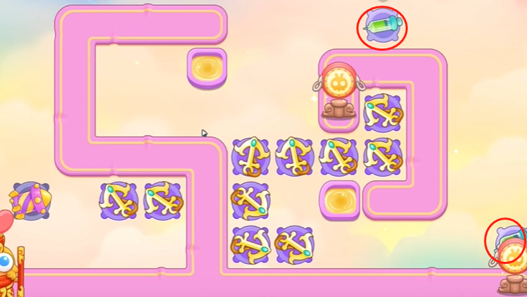 3、建立一个一级船锚,打钱袋,钱袋打掉,空出位置,建立船锚,继续清理周围障碍物,注意第二波有飞天兔,如果船锚没打死,在萝卜附近建立导弹。