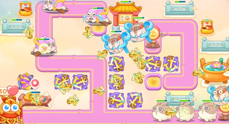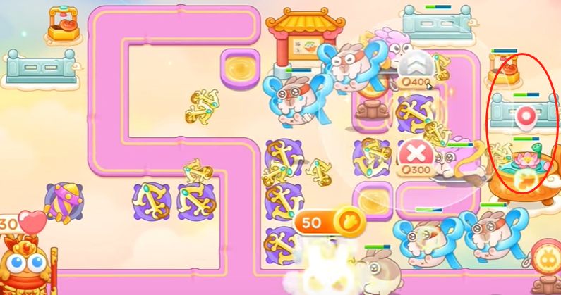 2、看见粉兔直接锁定,二级船锚升三级,左边兔子每个都锁定打。