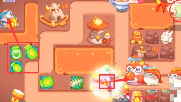 1、这一关可以使用的炮塔是:喷火器、雪花、手电筒、鱼刺、乒乓球、毒针、普通炮塔,这一关我们主要输出用鱼刺。