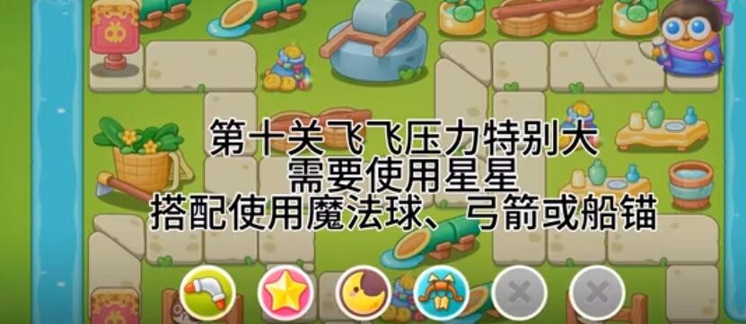 1、纸鸢探春第10关飞飞压力特别大,需要使用星星,搭配使用魔法球、船锚或者弓箭。