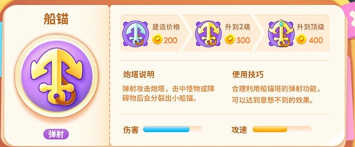 1、是弹射攻击炮塔,击中怪物或者障碍物后会分裂出小船锚;