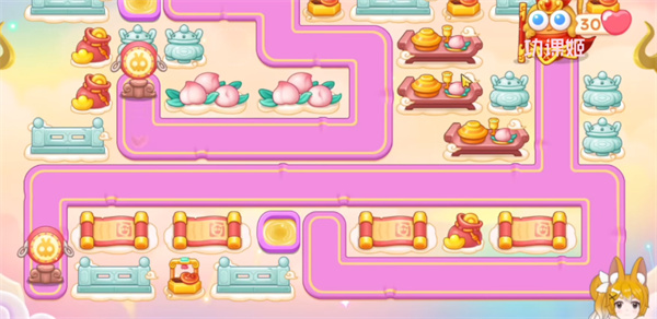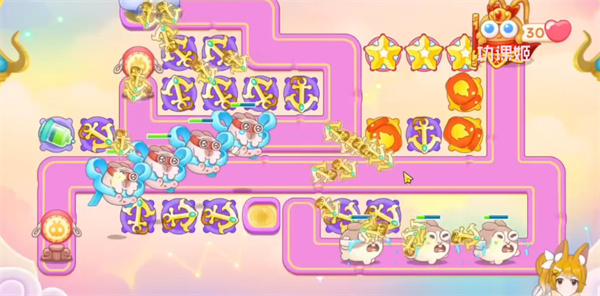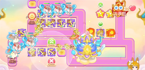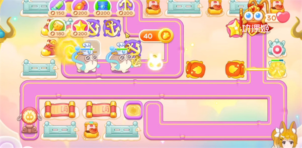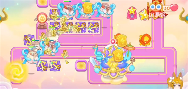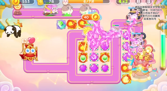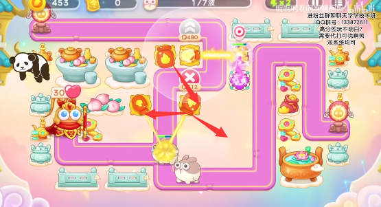 3、右侧位置要多放魔法球,锁定粉兔和仙女打,中间也要补上道具,放火瓶炮和魔法球就行优先升级火瓶,再升级魔法球;