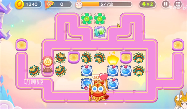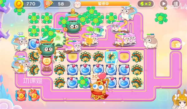 1、首先我们开局在左边道路安置一个多重箭清除障碍物,在地图中间上方安放两个电风扇进行输出,优先攻击兔子怪。