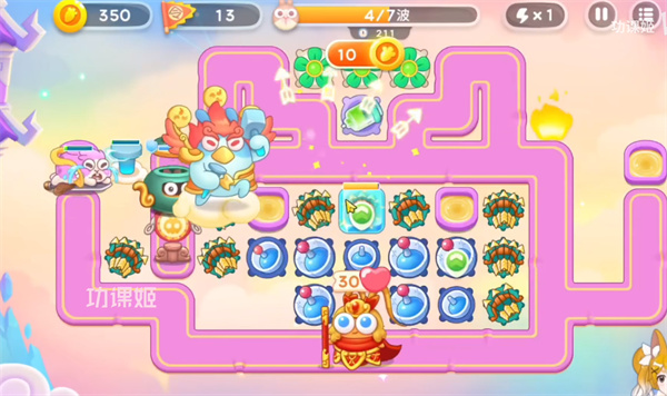2、接着我们按照下图所示摆放炮台,优先清除障碍物,我们优先锁定莲花鼎进行输出。