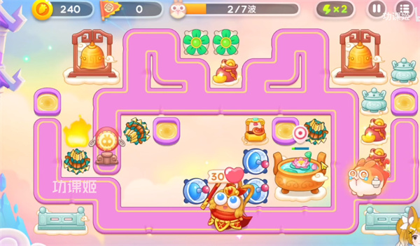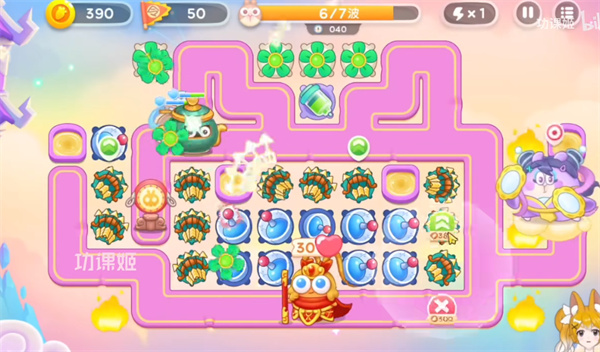 1、首先我们开局在左边道路安置一个多重箭清除障碍物,在地图中间上方安放两个电风扇进行输出,优先攻击兔子怪。