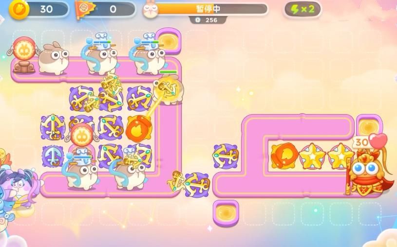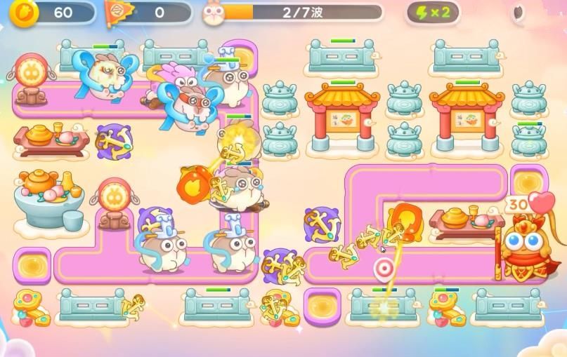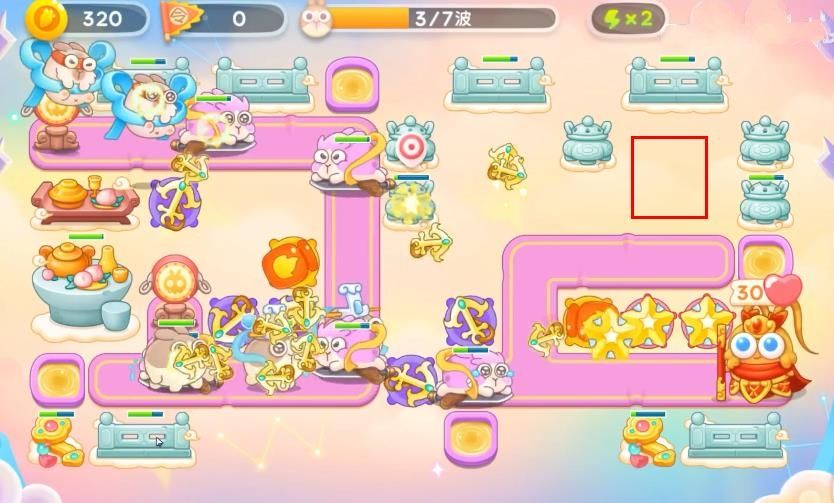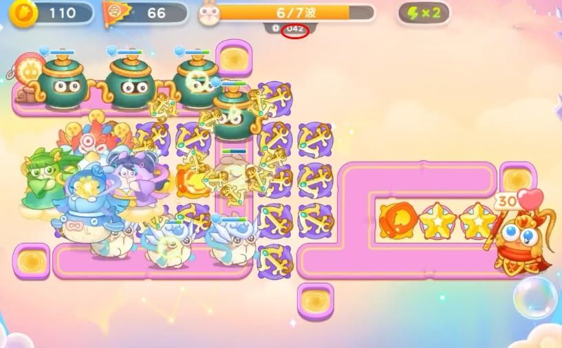 11、第6波布局如下图,求稳的话就不锁神仙先锁粉兔,倒计时45秒左右建议这波兔子不锁神仙,优先打中间的兔子