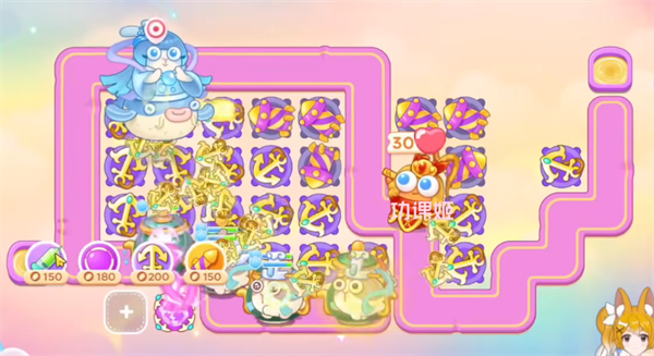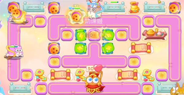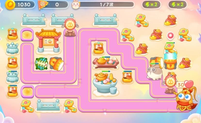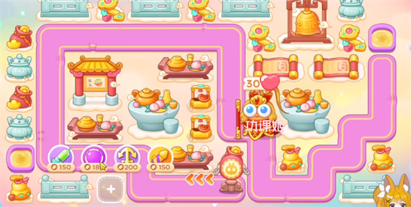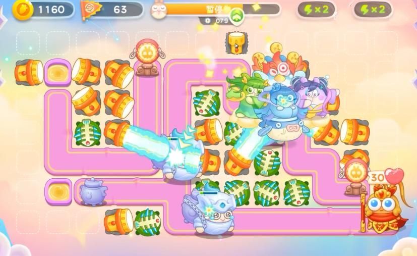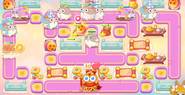 4、大家建造房防御塔的时,记得一定要暂停,不然的话是特别容易漏怪的,有金币后继续在左上角补一个保龄球,直至钱袋打完;