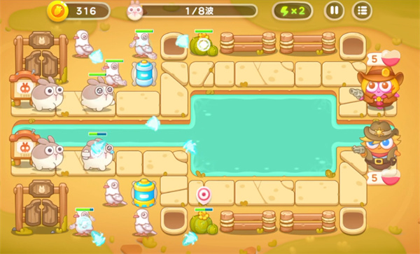 1、首先开局在左侧道路两侧放置冰桶在清场小怪的同时清除障碍物。