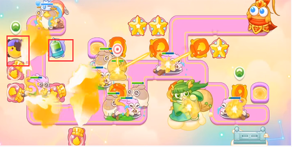 3、第四波,我们在第三波清图的基础上我们在出口处放置一个毒针来进行防守,月亮来进行减速,我们注意神仙释放的道具优先清理清理之后,我们继续锁定神仙打;