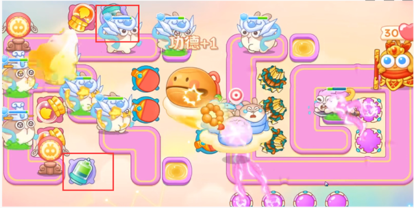2、第二波,如意放置多重箭,多重箭打钱袋子,红色框框的的香炉乡里之后,我们放置魔法球,我们清图主要先清理右边的位置,放置好之后打萝卜门;
