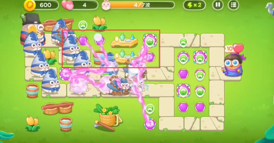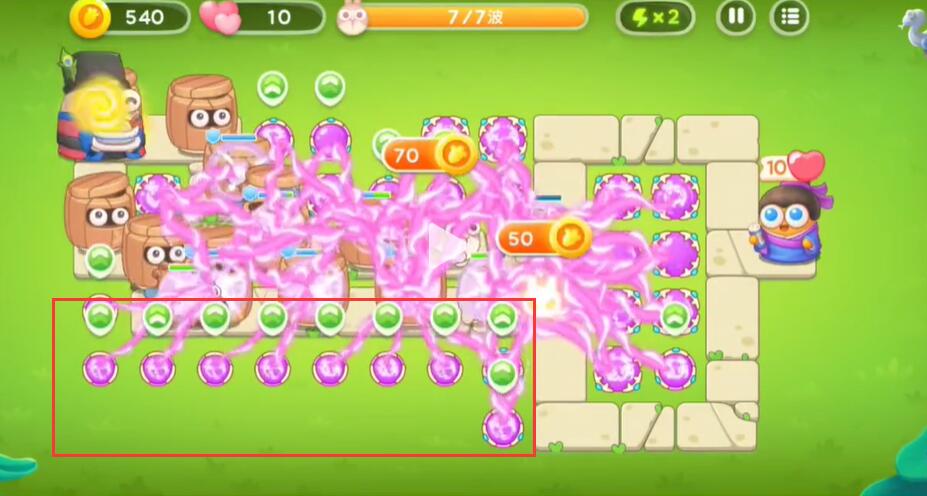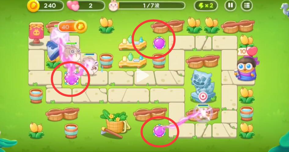 1、玩家进入游戏关卡后在下图标记处放上魔法球,左边的用来清怪,右边的清建筑,有钱之后在左边的空位上多摆放几个(如图2)。