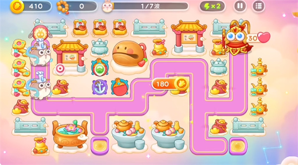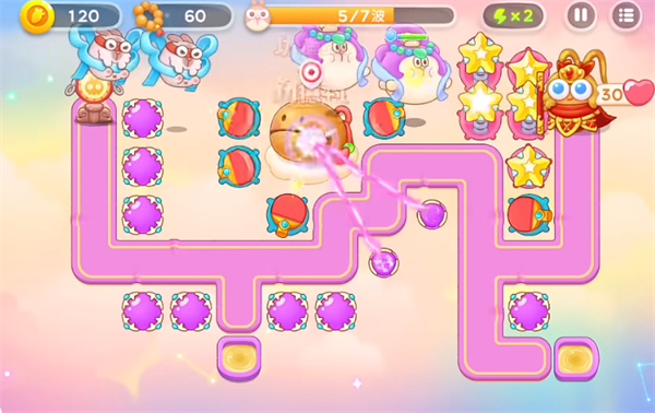 1、开局在中间区域放置两个乒乓球进行输出,再建造一个船锚优先锁定钱袋子进行输出获取金币。
