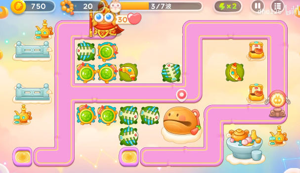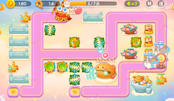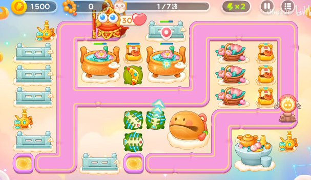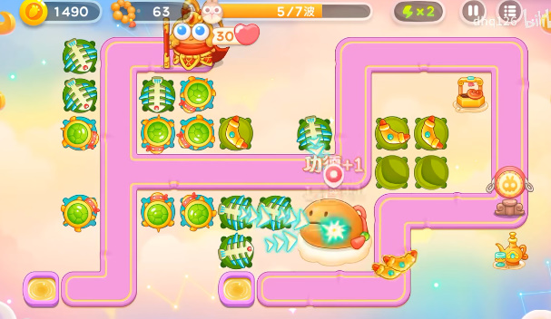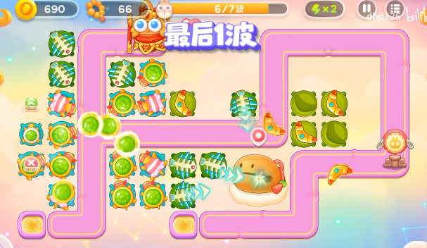 1、萝卜的下面放上一个回旋镖,然后锁定下面的道具攻击,有空位就补充鱼骨塔。如果有漏网之鱼上去了就锁定水井就可以攻击到了。
